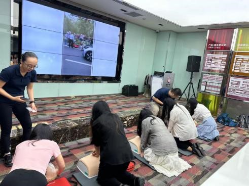 本次培训班邀请了急救专家担任讲师,内容涵盖了心肺复苏的基本理论知识、操作技能,AED的使用方法,创伤急症、内科急症和气道异物梗阻的现场处理。在讲师的指导下,参训职工分组从判断意识和呼吸、胸外按压、人工呼吸,到使用操作自动体外除颤仪(AED),进行模拟练习。此外,通过实践演练,参训人员均知悉了公司AED设备所在地点,可在1-2分钟内取得AED设备。