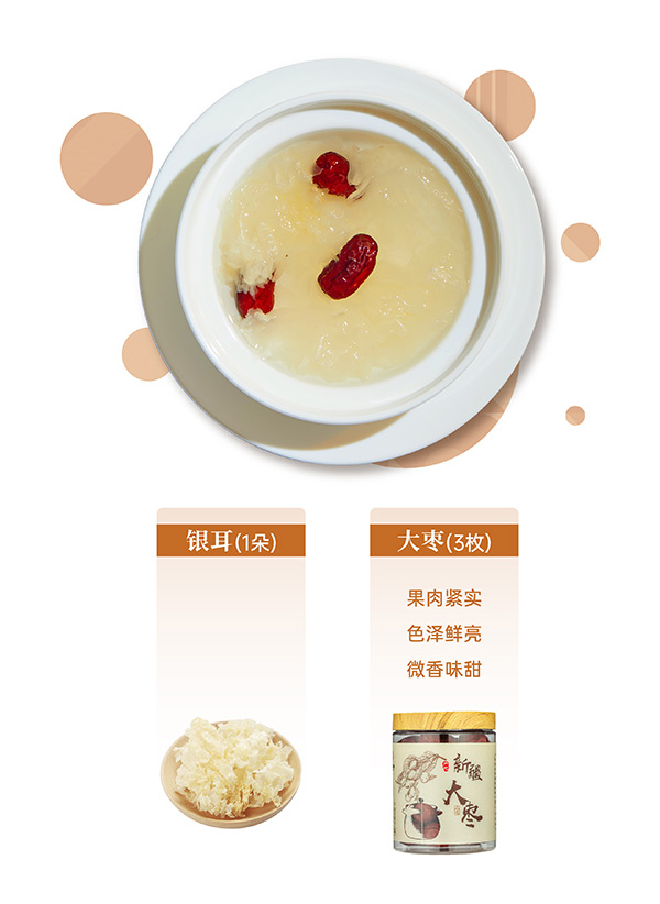 银耳冷水泡发后撕成小朵,红枣去核洗净备用;全部食材放入锅中加入适量清水,大火烧开转小火炖煮1小时,出锅即可食用。
