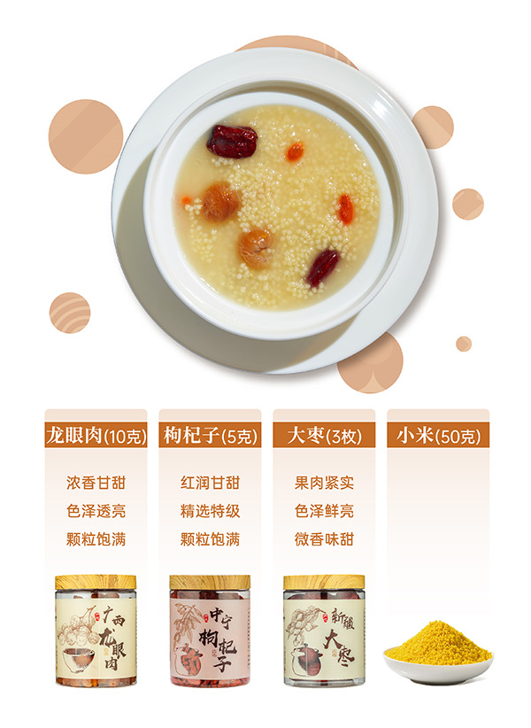 将食材洗净,锅中加入适量清水,先将小米武火煮8分钟,随后再下入龙眼肉、枸杞子、大枣,20分钟后煮成稀粥即可食用。